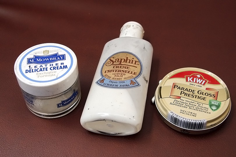 つや出しは、油性靴墨のほか、ロウ分が入っているレザーローション、