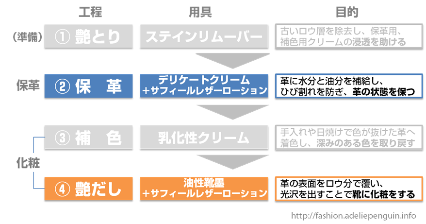②……保革はデリケートクリームに加えてサフィールレザーローションで行い、