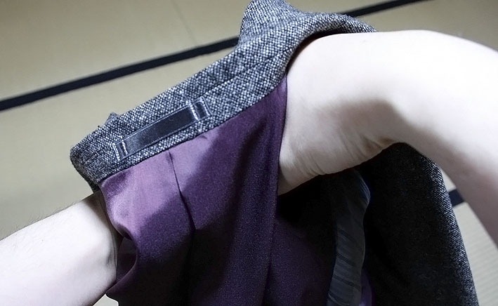 まずは、スーツの両肩に両手を入れ、肩を拝みあわせて下さい。