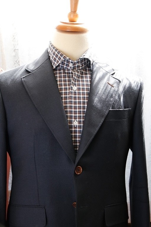 とりあえず、紺色のバーズアイ柄ジャケットを着せてみました。