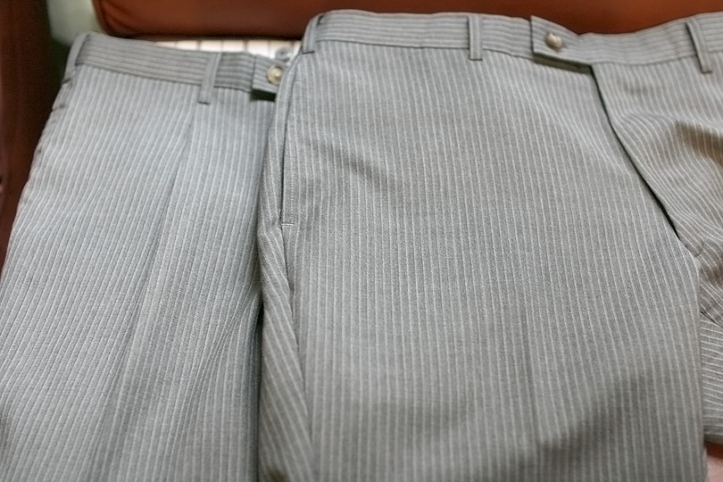 ▲ 左が股上深めのスリーピース用、右が浅めのツーピース用。イージーオーダーなどでスペアズボンとして作れば、安く揃えることが出来る。後の股上をさらに深くし、ベルトループを取るなどブレイシーズ専用の本格仕様にする手も。