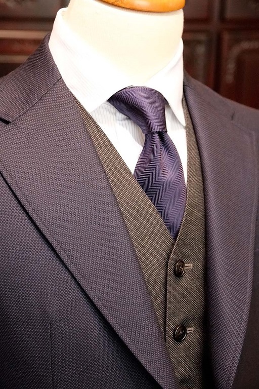 写真はグレイのウェストコートに、紺のジャケットを着用した例です。