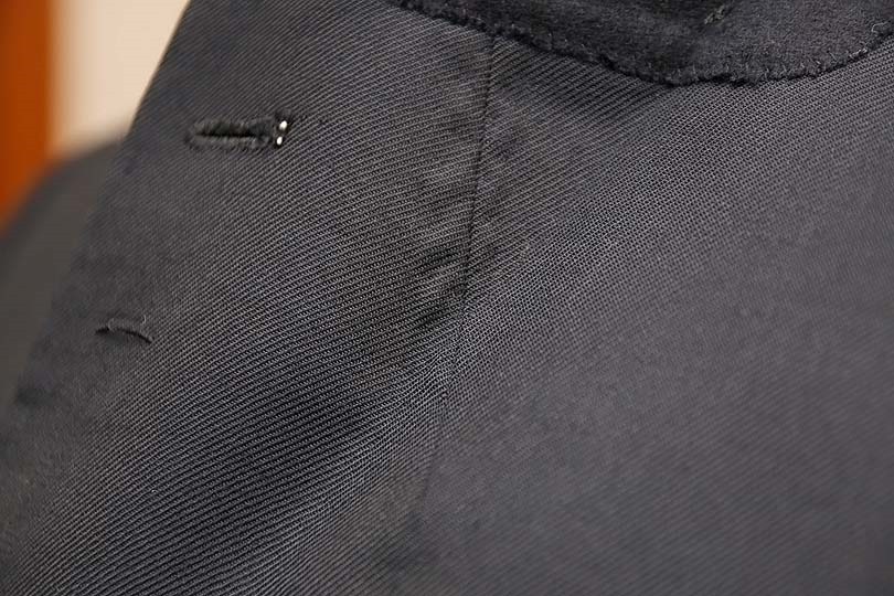 なお、胸の浮きを解消する方法としては襟ぐりを小さくするほかに、あごダーツがあります(あごグセ、ゴージダーツ)。写真中央の縦に走る線があごダーツで、ちょうどラペルの裏側にあります。これで胸の形状が立体的になり、ある程度浮きをとることが出来ます。
