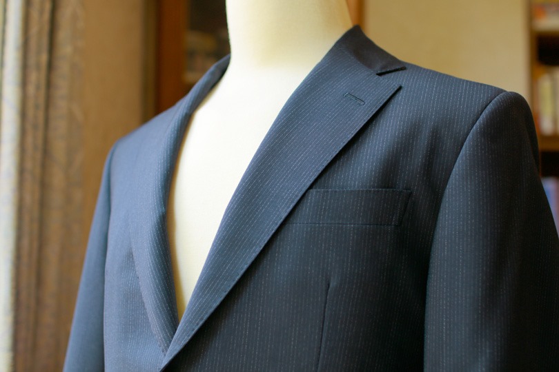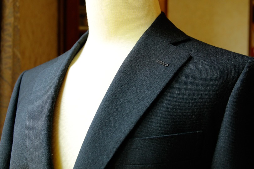 地味なチャコールグレイなのですが、よくよく見るとモヘアの上品な光沢がわかります(テラテラとしたいやらしさは全くありません)。春夏に「お堅い場」に出るのであれば、こういったスーツがお薦めです。