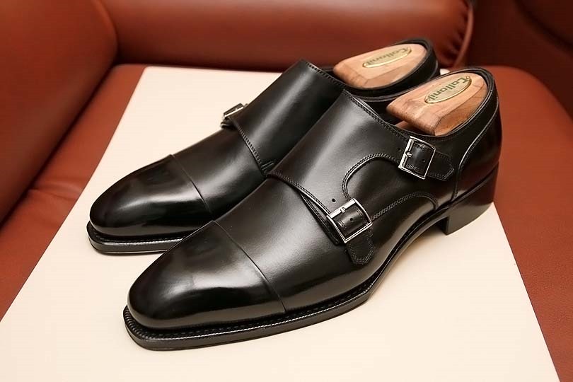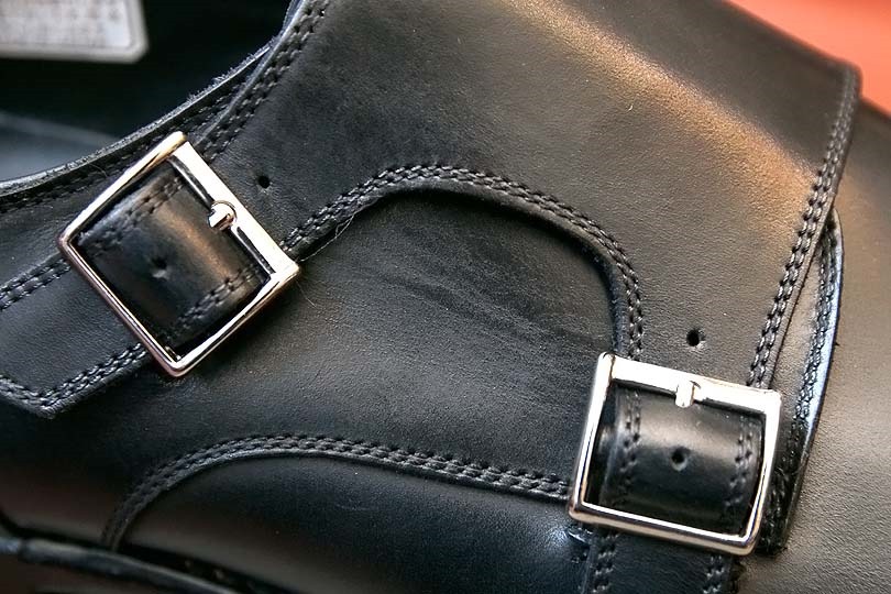 前回購入した「グラスゴー」(下の写真)と比較すると、ノーズやバックルが丸く、柔和な印象です。グラスゴーがバリバリのビジネス用だとすると、アーバインのダブルモンクは週末のジャケパン用途にもってこいの顔をしています。