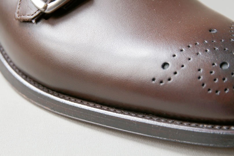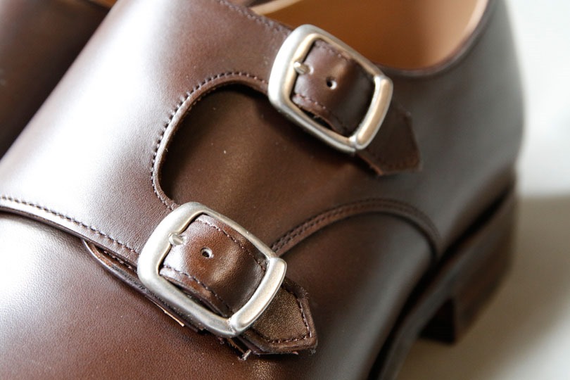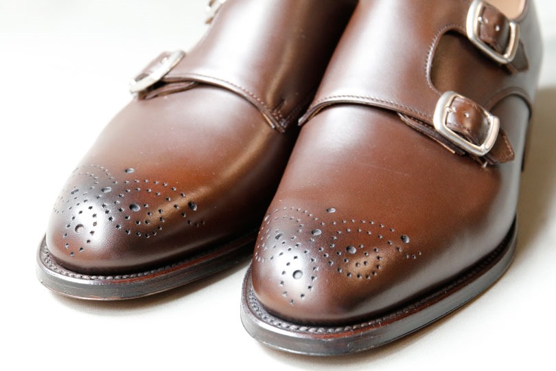 一方で、ちょっと傾けると、コバの綺麗さからかすこしシャープな印象が増します。ダブルモンクはバックルの形状が丸いため、それでもカジュアルな印象はぬぐえず、タイドアップしたカチッとしたスタイルには、ハーフブローグの方が良いかも知れません。