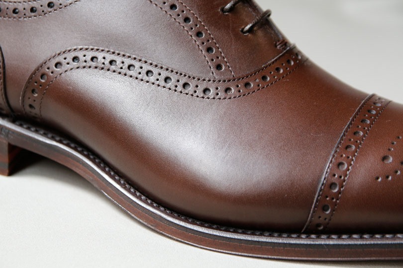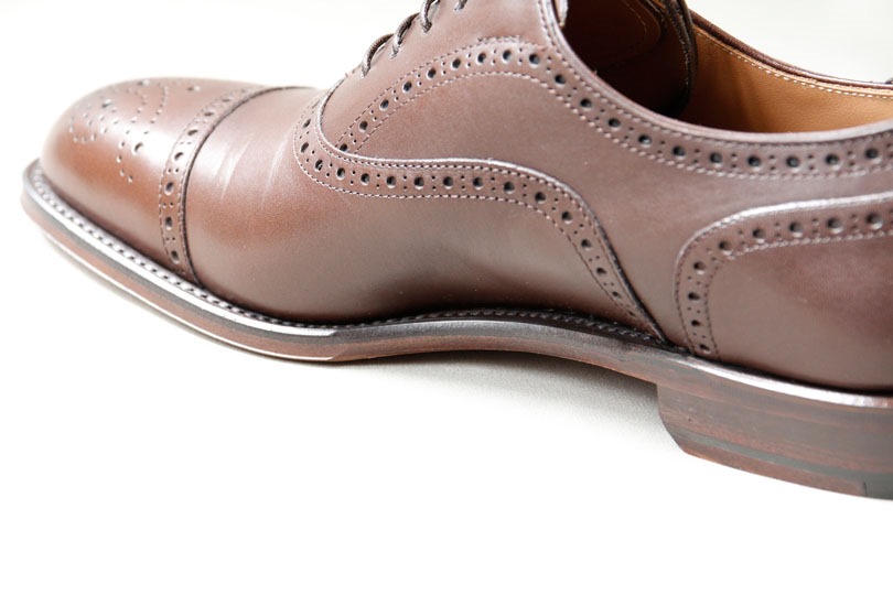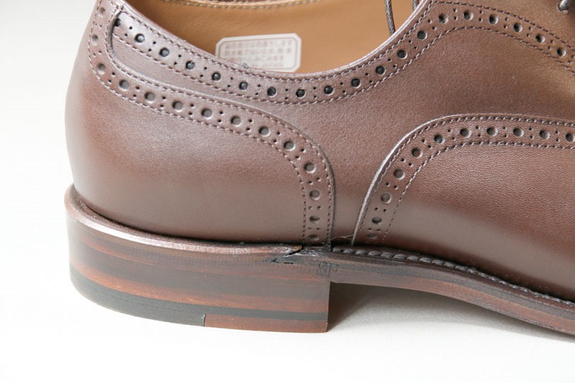 先端に施された飾り穴(メダリオン)。工場出荷時の磨き工程で、若干アンティーク加工ぽく、先端のみ濃い色の靴墨が入れられているのが分かります。好みが分かれるところではありますが、この靴の顔ならばアリかな、という感じは受けます。