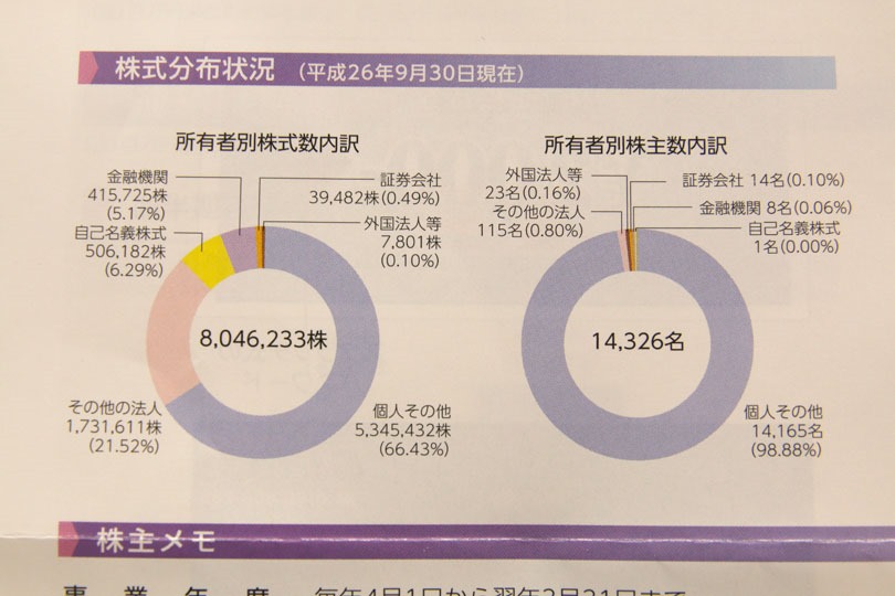 個人株主が発行株ベースで66%、株主ベースで99%と、おそらく皆さん優待目当てで購入されているのではないでしょうか。