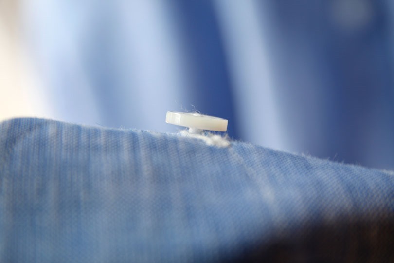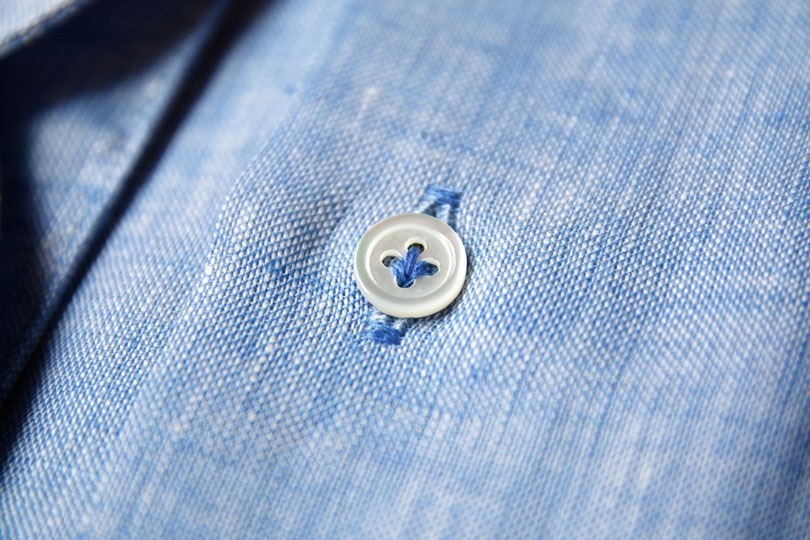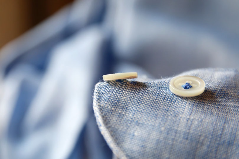 (参考:do-1ソーイングのシャツ)ボタンを留めた際に、シャツの生地が挟まるだけの余裕が、ボタンとシャツ生地の間に開けられています。