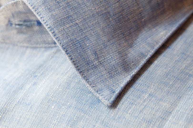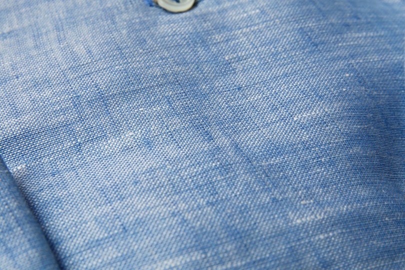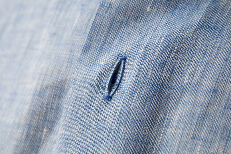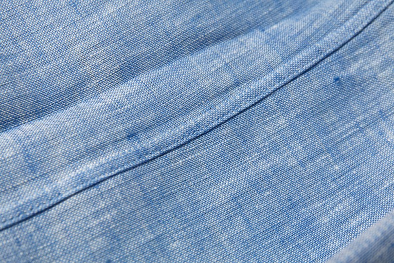 麻100%の生地。かなり好みのシャンブレーです。肌触りも張りがあるのに柔らかく、着心地が良いです。