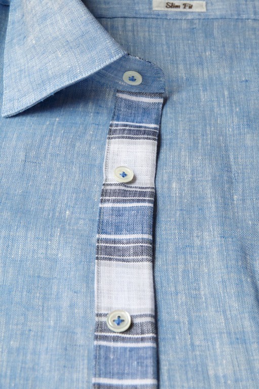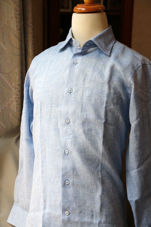 商品名:国産長袖麻 リネン100 スリムフィット シャンブレーブルー セミワイドカラー