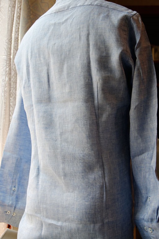 開襟での様子。別布がちらっと見える感じです。堅い職業でなかったら、クールビズとして着て行けると思います。もちろん、週末のスタイルにも最適だと思います。