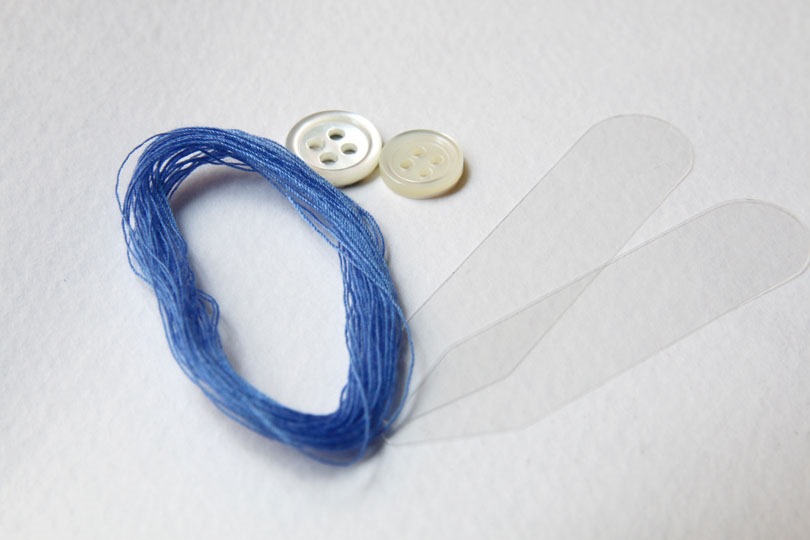 ボタンは高瀬貝。青い縫い糸で、千鳥足で留められています。