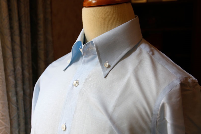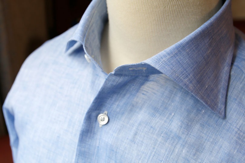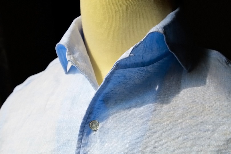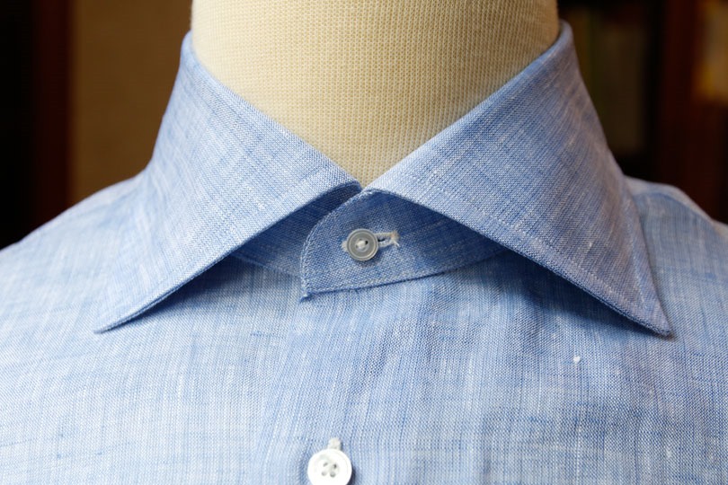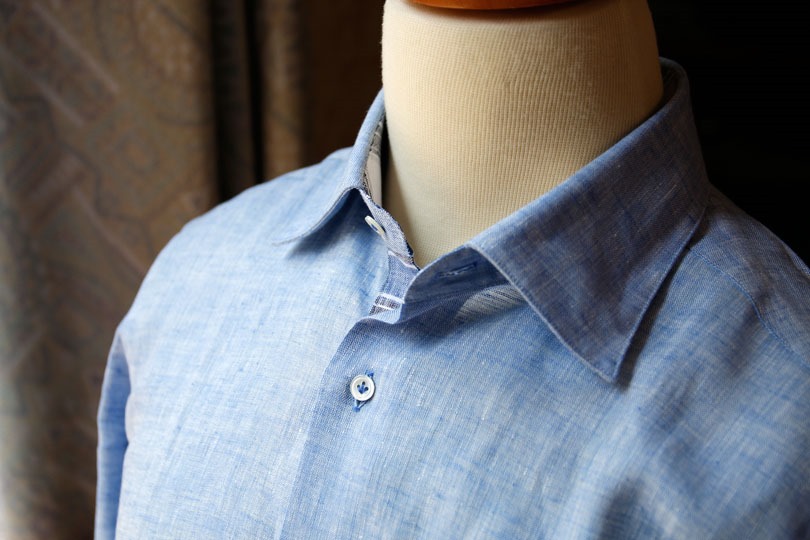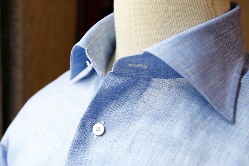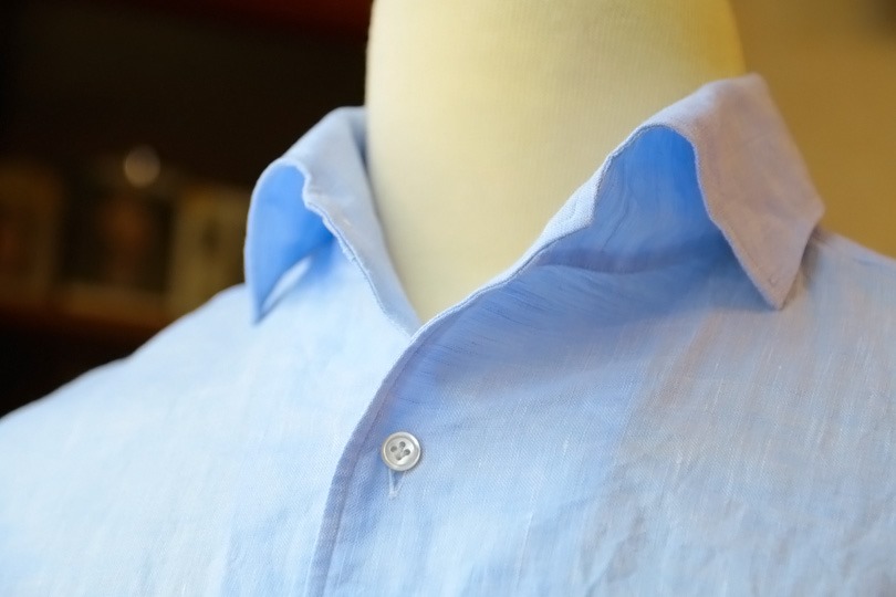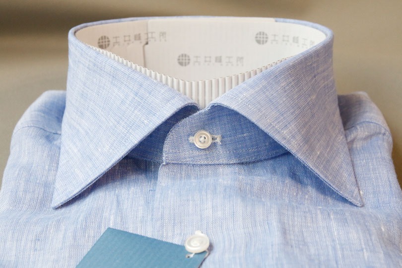 ▲ ビジネスに使える麻シャツの一例。襟の芯地が堅く、カラーステイも装着可能でビジネス用途を意識した造りになっている。