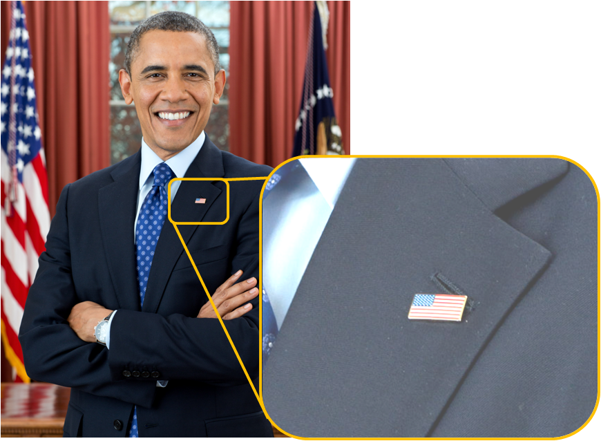 ただ、必ずしもフラワーホールのみに徽章が取り付けられるわけでは無いようです。たとえば、アメリカ大統領の星条旗バッジはなぜかフラワーホールで留められていません。