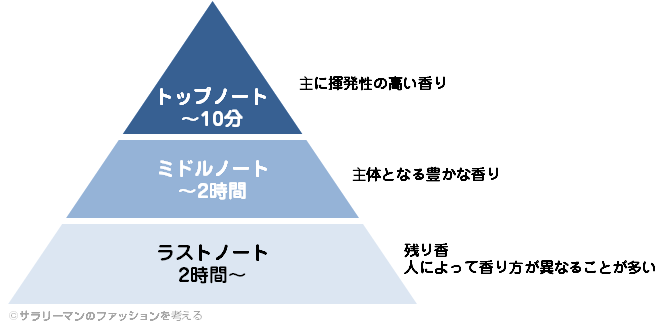 香水は様々な材料をもとに作られているため、時間経過で香りが変化していきます。付けてから10分程度香る「トップノート」、メインの香りで2時間を目安に香る「ミドルノート」、それ以降の通奏低音的な残り香である「ラストノート」の3つに分かれます。