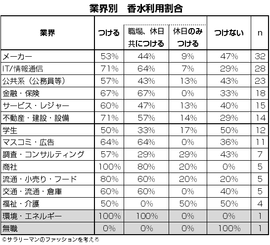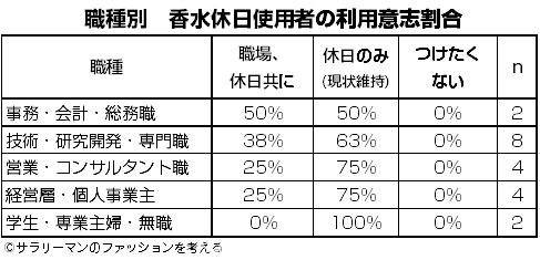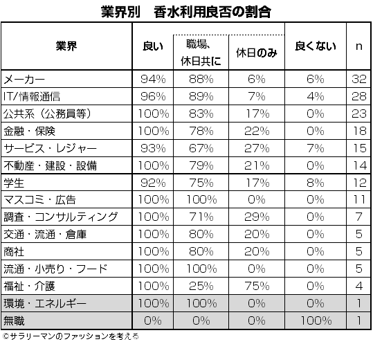 サンプル数が5ではありますが、商社の香水利用率100%はイメージ通りと言ったところでしょうか(職場休日共にも80%と、かなり高い割合です)。