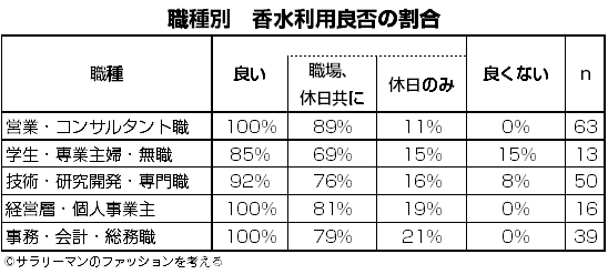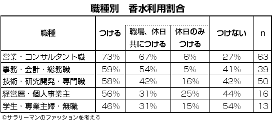 営業・コンサルタントなど、外回りや顧客との接点が多い職種は日常的に67%が、休日を足すと73%が香水を利用という結果で、これはほぼ予想通りです。