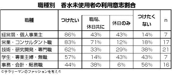 いま、香水を全く利用していない人について、どの程度つかってみたいと思っているのかを表したのが上の結果です(nが少ないので、表は職種別のみを掲載しました)。全体の65%が香水を利用したいと考えており、そのうち66%(全体の43%)が職場でも利用したいと考えているようです。