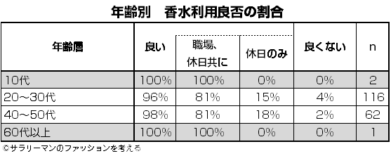 (20~30代、男性、サービス・レジャー、事務・会計・総務職)「女性の適正な化粧がマナーであるように、男性の適切な香水使用もそうなるような社会になると面白いなと考えます。」