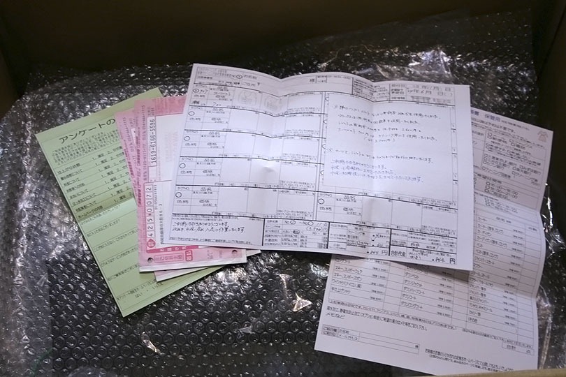 左からアンケート用紙、冬物を送り返す際に使う着払いの伝票、