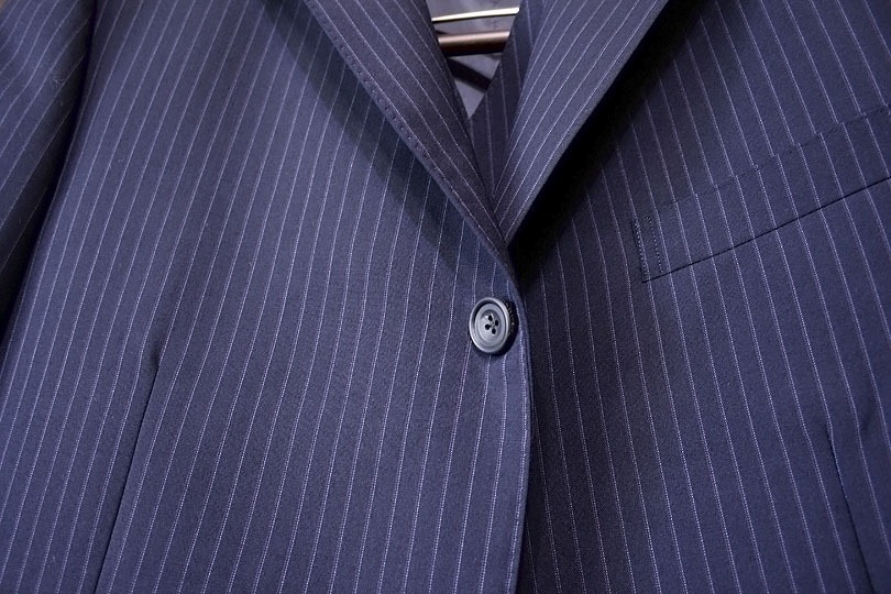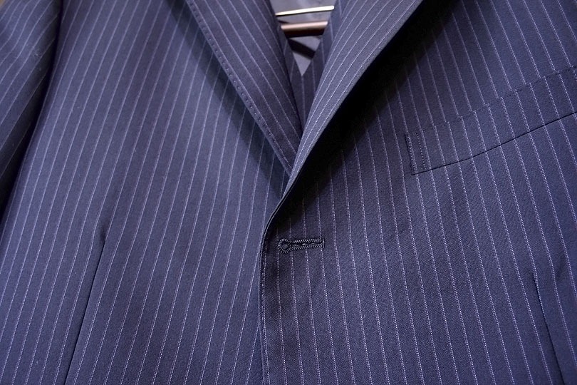 ※三つボタン段返り:真ん中のボタンだけで留める形式。一番上のボタンは単なる飾りで留めず、ラペルの裏側に隠れる。質の低いクリーニング業者では三つボタンと勘違いして、飾りボタンの上の部分にプレスをしてしまうことがある。