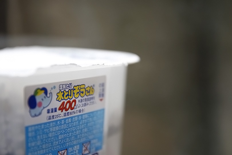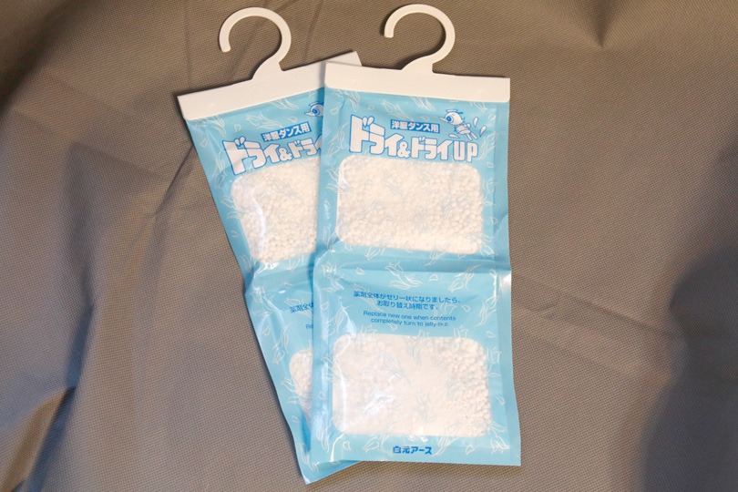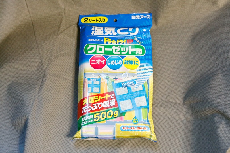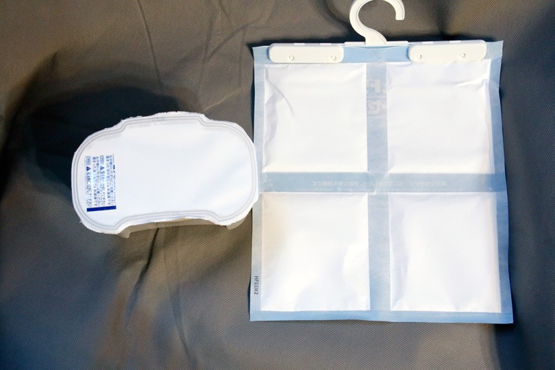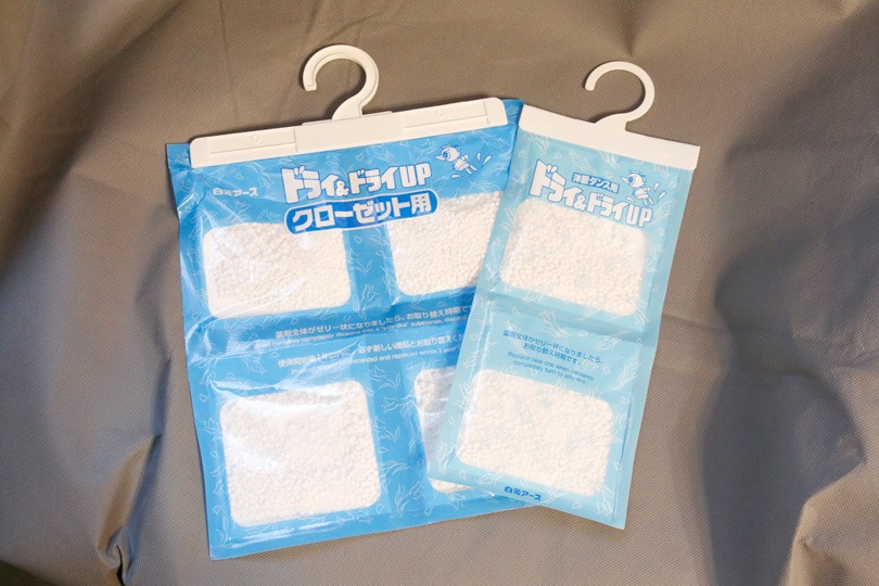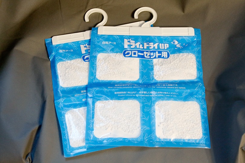 今回、据え置きタイプにはオカモトの550gタイプを2つ使いました。つまり総容量は1,100gです。一方、ハンガータイプは250gタイプを1つ。吸湿の総容量的には、クローゼットタイプが4分の1以下の能力ですが、結果はクローゼットタイプに軍配が上がりました。
