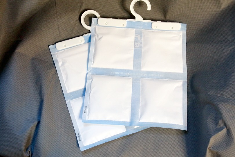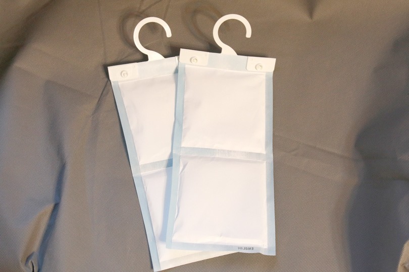 除湿剤が小分けされた袋に入っており、それを一体型のハンガーでクローゼット内に吊すことが出来ます。除湿剤の内容そのものは、基本的に据え置きタイプと同じものが使われており、発売しているメーカーもだいたい同じです。(防虫剤や防カビ剤などを添加した物もあるようです)