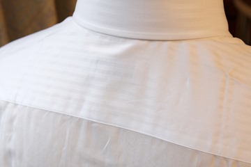 ヨーク(肩)は一枚布です。ストライプ柄なので、スプリットヨーク(真ん中が切り返しになり、への字型にストライプが走る)になっていた方が個人的には好みです。