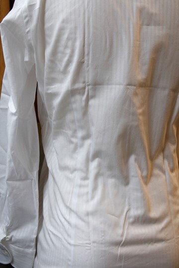 後ろからの様子です。スリムフィットを謳うだけあって、ダーツ(背中~腰にある生地のつまみ)による絞りはかなり綺麗です。