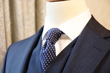ドット柄のタイに、紺のスリーピース(三つ揃い)スーツを合わせてみます。レギュラーカラーだとウェストコート(ベスト)の上にシャツの襟が載ってしまい不格好になることがありますが、ワイドカラーの場合は上手く収まります。