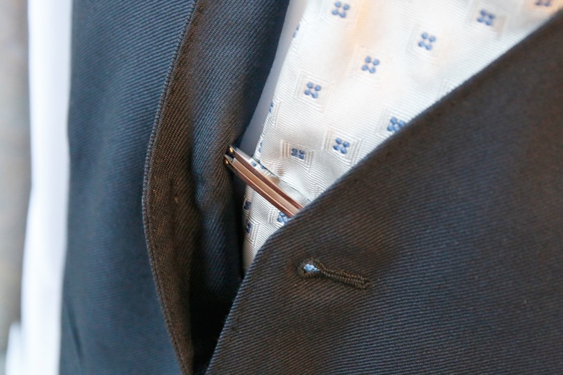 ポケットチーフは礼服で採り入れられているディテールで、これもドレス度と華やかさをあげるために、有効なツールです。