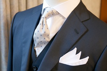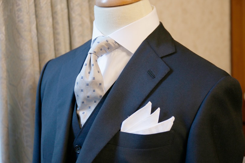 同じスーツでも、スリーピースにするだけで、すこし改まった雰囲気になります。今回つ買っている写真は共地のスリーピースですが、たとえばライトグレーのウェストコート(ベスト)に替えると、さらに華やかな雰囲気になります。