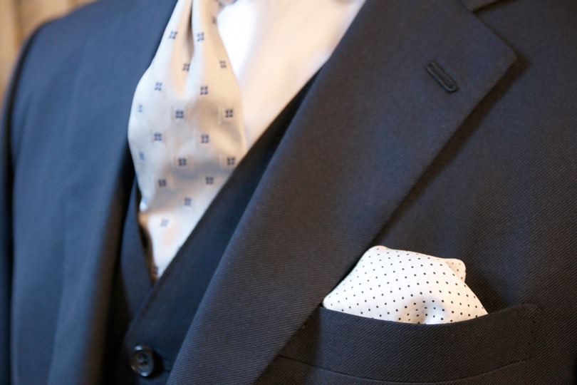 ブラックスーツでも特段問題ないとは思いますが、披露宴(慶事)なら日本でもダークスーツが認められていること、また、ダークスーツの方が華やな装いをしやすいこと、西洋では慶事にブラックスーツがあまり用いられないことから、私はダークスーツの三つ揃いを選んでいます。