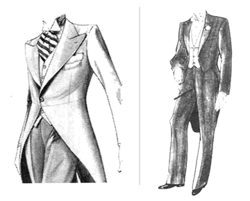 現代西欧の礼服は、着用する時間によって種類が分かれます。 日中の礼服がモーニングで、少しドレスダウンしたものがディレクターズスーツ、夕方以降の礼服は燕尾服(テイルコート)で、同じくドレスダウンしたものがディナージャケット(タキシード)です。