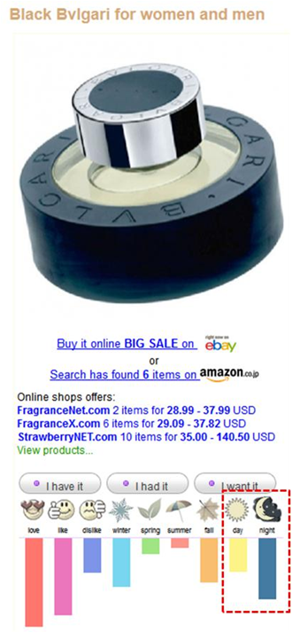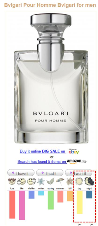 上記の画面が表示されます。ここで、赤い点線で囲った部分が日中用か夜用かを表していて、この香水は日中向きであることが分かります(得点は、あくまで利用ユーザの評価で成り立っています。また、投票数が少ないときは評価がぶれる事があるので、他のサイトも確認してみて下さい)。