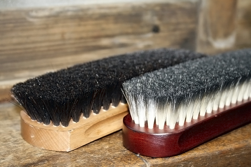 左からホコリを落とす用のブラシ(チャーチの馬毛ブラシ)、