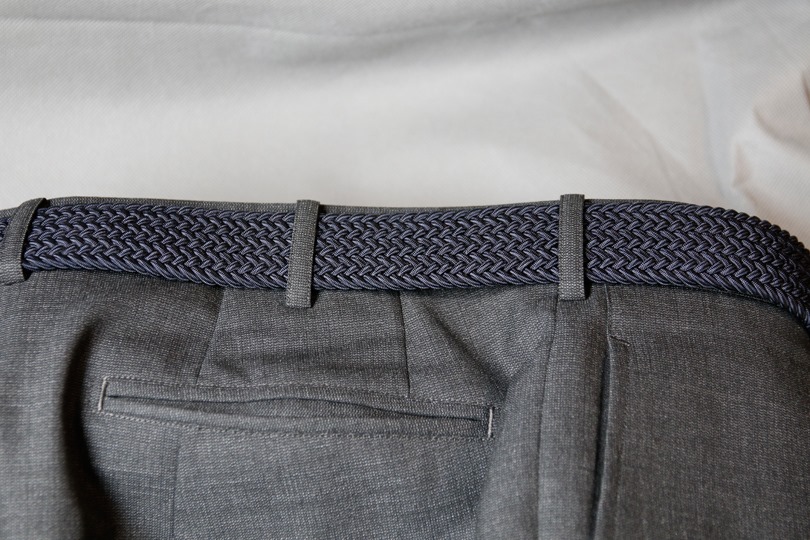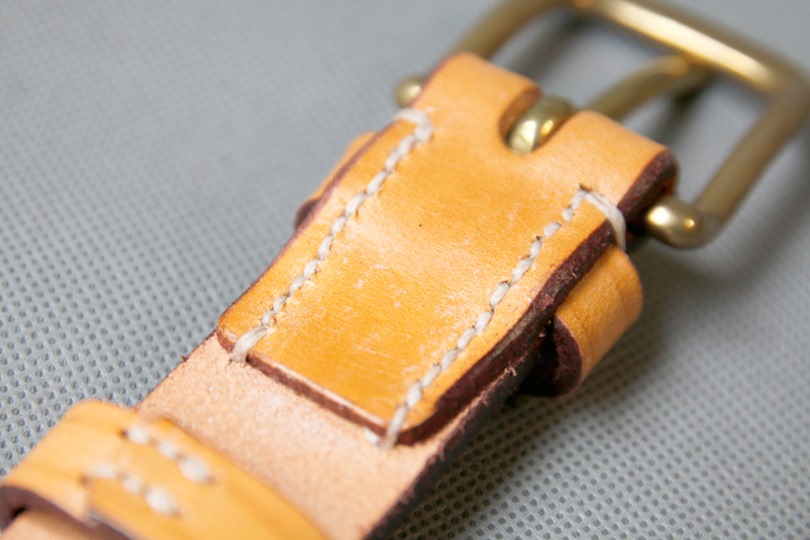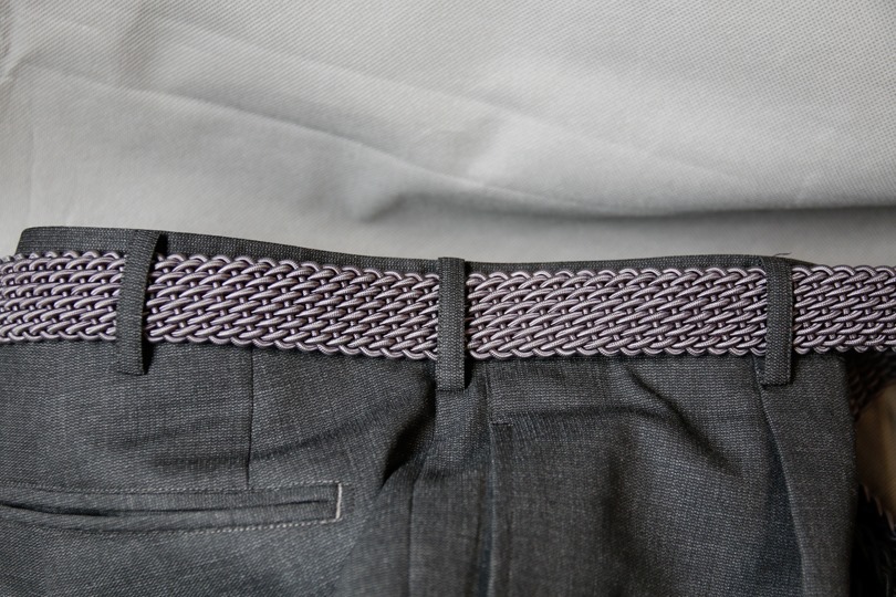 上の写真は右が3センチ、左が3.3センチのベルトです。僅か3ミリの差なのですが、同じズボンに通してみると、結構印象が変わります。