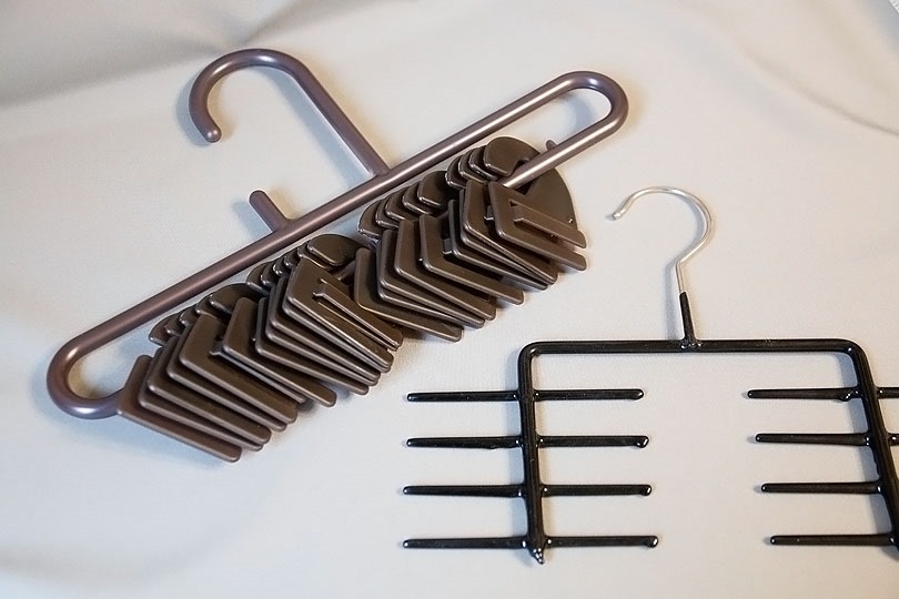 一番のお薦めです。一覧性に優れ(選びやすい)、取り出すときに他のタイに干渉しにくいので確実に一本だけ取り出す事が出来ます。また、クローゼットの中で落ちる事も有りません。(クローゼットは暗く、いったん落とすと探しにくいんですよね……。)