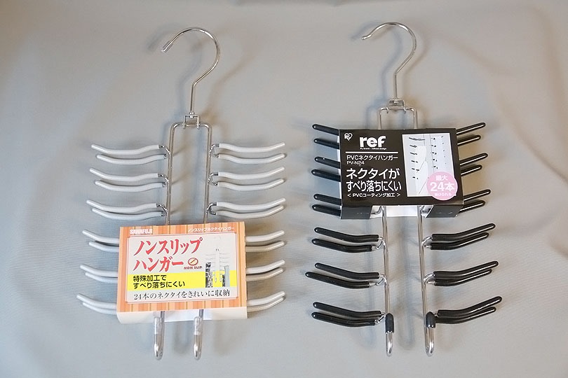 そしてこちらが今回の記事用に買ってみた2本。どちらも似た様なタイプですが、左がサワフジのノンスリップネクタイハンガー、右がアイリスオーヤマのPVCネクタイハンガーです。どちらも6×4で24本のネクタイを掛けられるという製品です。