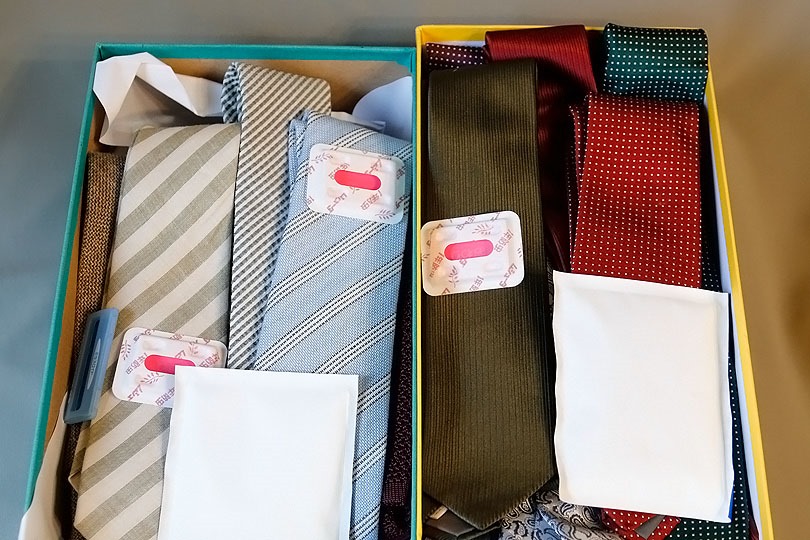 写真はオフシーズンのタイです。靴が入っていた箱に包装紙を敷き、タイを平置きにして入れ、カビ防止剤が入った防虫剤と引き出し用の除湿剤を入れています。