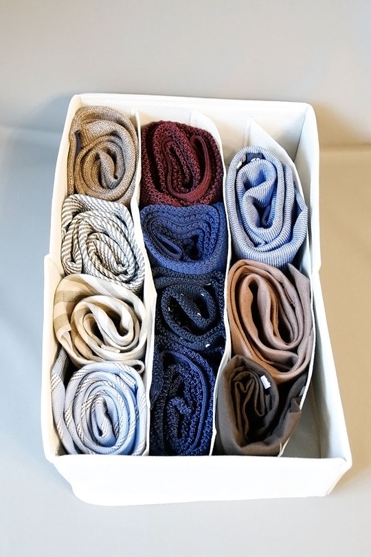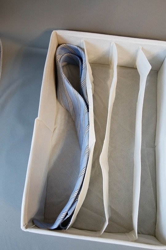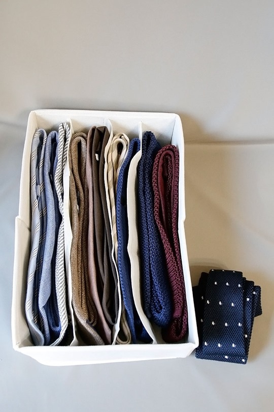 ちなみに、上記写真の左側靴箱に入っているタイを、見やすいようにと縦にして入れると……