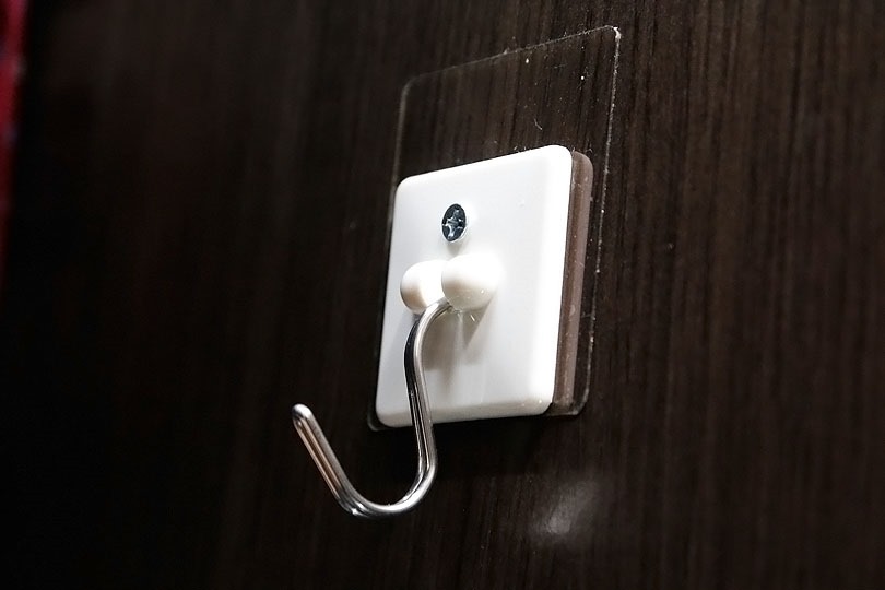 - 粘着シートを使わず木ねじや釘だけで固定するフックは、合板や木材チップを使ったクローゼットの場合重量に耐えられず不向き