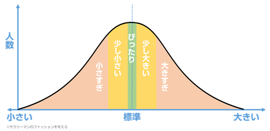 たしかに、一番人数が多くなるところを基準に作られてはいますが、そもそも緑色の部分「ぴったり」の割合が、全体に比べて少ないのです。(一番人数は多いが、カバー率が低い。)