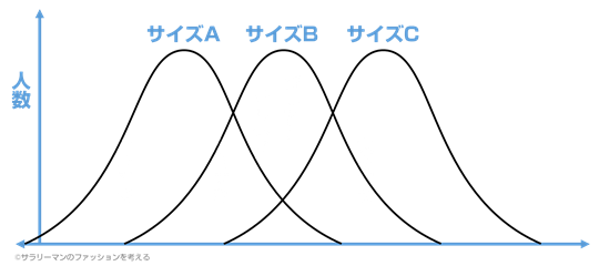 もちろん、メーカー側も下図の様にサイズ展開を増やす事で、極力体型に合うよう努力しています。しかし、サイズ展開はあくまで収益が見込める範囲でしか細分化されず、またサイズは服の至る所で合わせる必要があるため、全ての部分が「ピッタリ」になることは難しいことが分かります。
