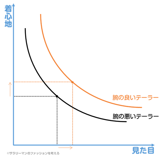 「体に沿うこと、着心地の良いことを優先するテーラーもあるが、デザイナーとしての実力があり、かつその振る舞いを心がけているテーラーは、常に補正後のシルエットやデザインを気に掛けているので、そういったデメリットは発生しにくい」