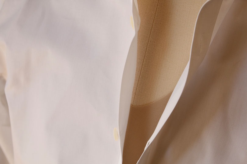 シャツを着せて、胸をはだけてみました。ご覧の通り、透けて見えることは殆どありません。