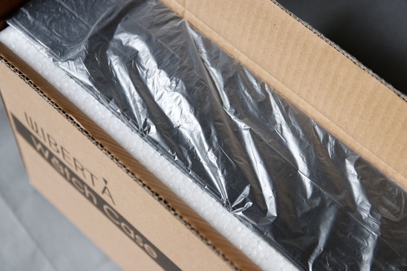 箱を開けると、発泡スチロールに囲まれた収納ケースが見えます。