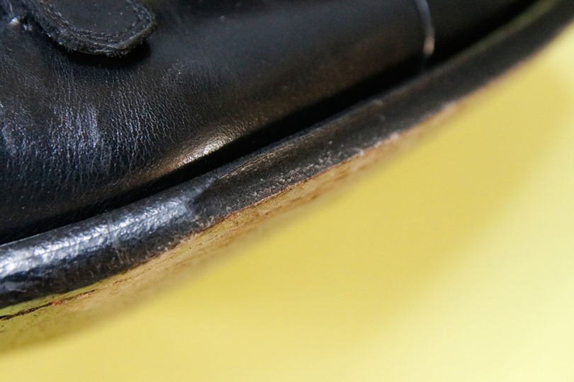靴のアッパー(甲革)と違い、コバ(靴底の外縁)は地面やオフィス内の什器と擦れる機会が多いため、けっこう色落ちし易い箇所です。