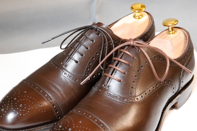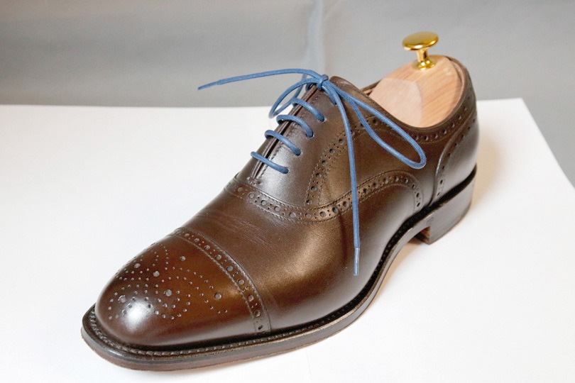 それぞれ純正の紐でしたが、ジョンロブの紐はロウがあまり付いてなく好みではありませんでしたので、エドワードグリーンの紐を新宿伊勢丹メンズ館で購入しそちらを使っています(1000円くらいだったと記憶しています)。